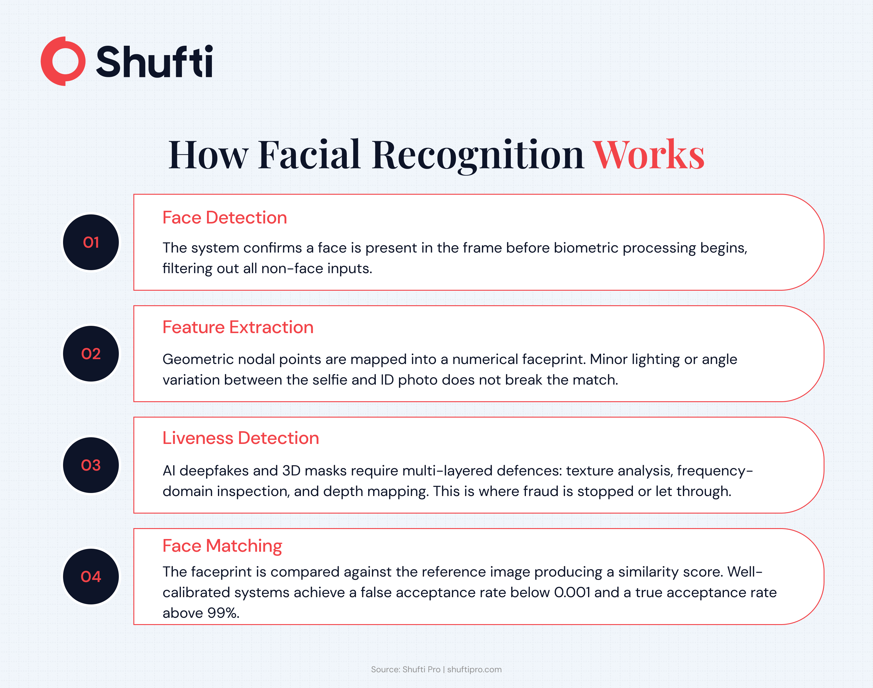Matching and Decision. The extracted vector is compared against a reference image (typically the photo on a submitted ID document). If the similarity score exceeds the defined threshold, the check passes. Liveness detection runs concurrently to confirm the submission is from a live person, not a photograph, video, or mask.