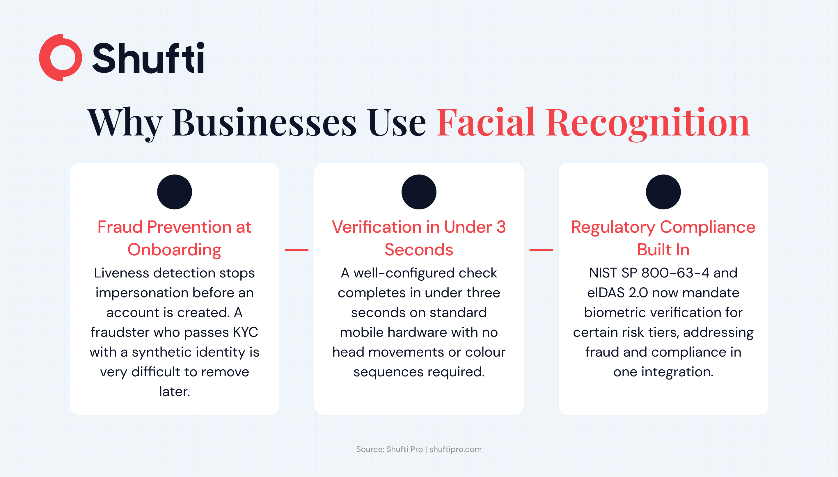 Facial recognition adds a layer of identity assurance that documents alone cannot provide. A stolen or forged ID can pass a document check, but it cannot pass a live biometric match. For regulated businesses, it also satisfies the biometric verification requirements of KYC/AML frameworks and reduces manual review workload significantly.