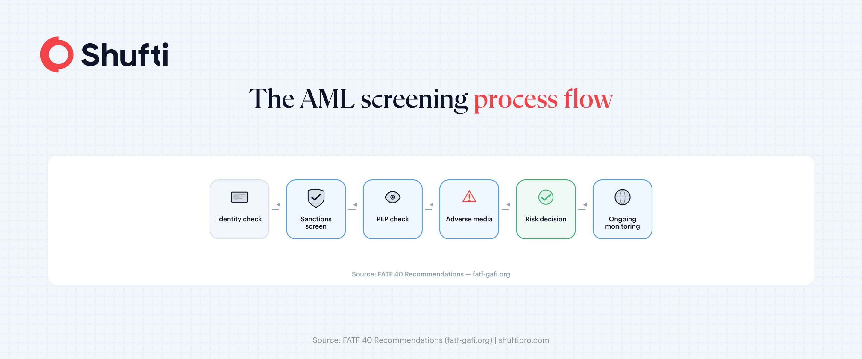 FATF’s 40 Recommendations are the international framework governments use to structure AML obligations. Regulated entities must identify their customers, assess risk, monitor activity on an ongoing basis, and report suspicious transactions to the relevant authority. AML screening is where those obligations land in practice. It is the mechanism between opening an account and processing a transaction.