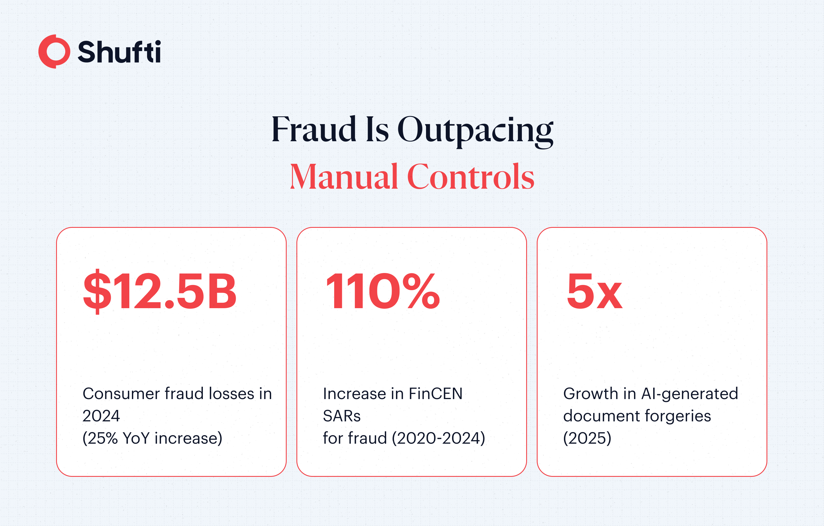 Fraud is scaling faster than manual controls can respond. The FTC reported $12.5 billion in consumer fraud losses in 2024, a 25% jump over the prior year (FTC). Deloitte estimates that AI-enabled fraud losses in the US will climb from $12.3 billion in 2023 to $40 billion by 2027, a 32% compound annual growth rate (Deloitte CFS). Document forgery, driven by generative AI tools that produce convincing fake documents for under $30, accounts for a growing share of these reports.