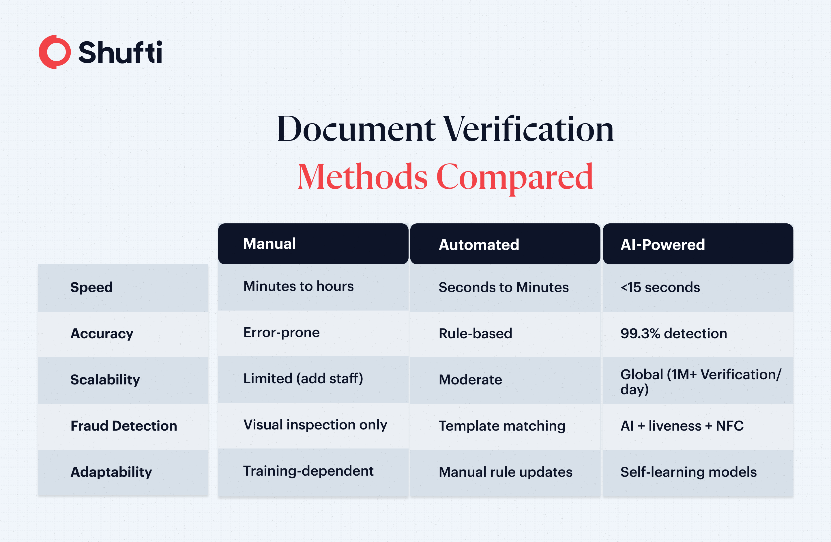 The monthly volume of AI-generated document forgeries increased nearly fivefold between April and December 2025, according to analysis reported by Help Net Security. For compliance teams processing thousands of onboarding applications each month, every forged passport or altered utility bill that slips through is a regulatory liability waiting to surface. Verification volume grows as a business expands into new markets or launches new products. Manually reviewing each document at larger volumes becomes the major hindrance in growth of the business as well as source of user frustration due to long waiting for verification.