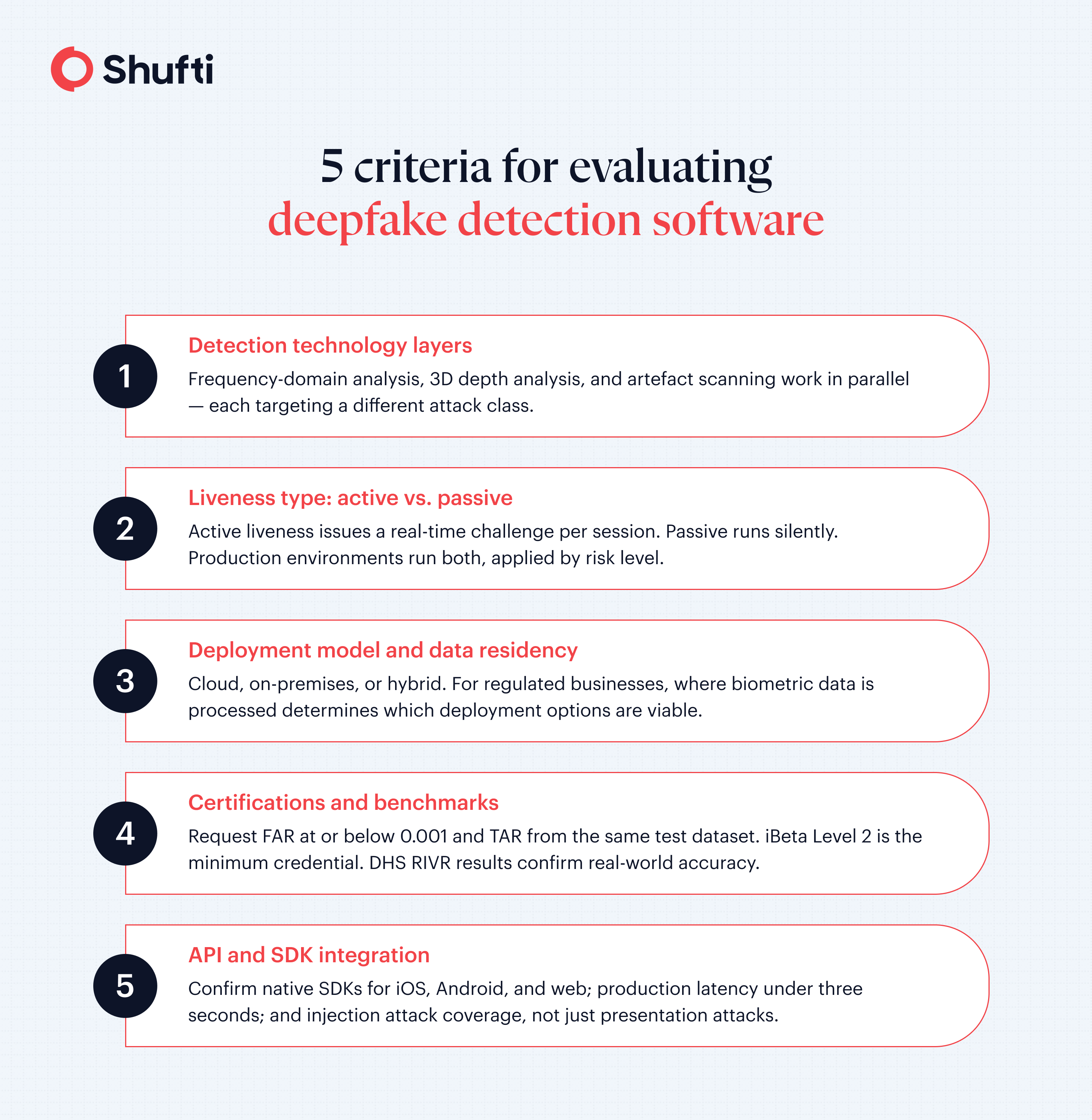Enterprise buyers should look beyond headline accuracy numbers. The capabilities that separate production-grade solutions are: multi-vector detection covering both presentation and injection attacks; iBeta Level 1 and 2 certification as a minimum independent benchmark; on-premises or hybrid deployment for data residency compliance; a unified API or SDK connecting with existing verification and AML workflows; and a documented escalation path with human specialist review. Vendors that can demonstrate all five in a live environment are the ones worth shortlisting.