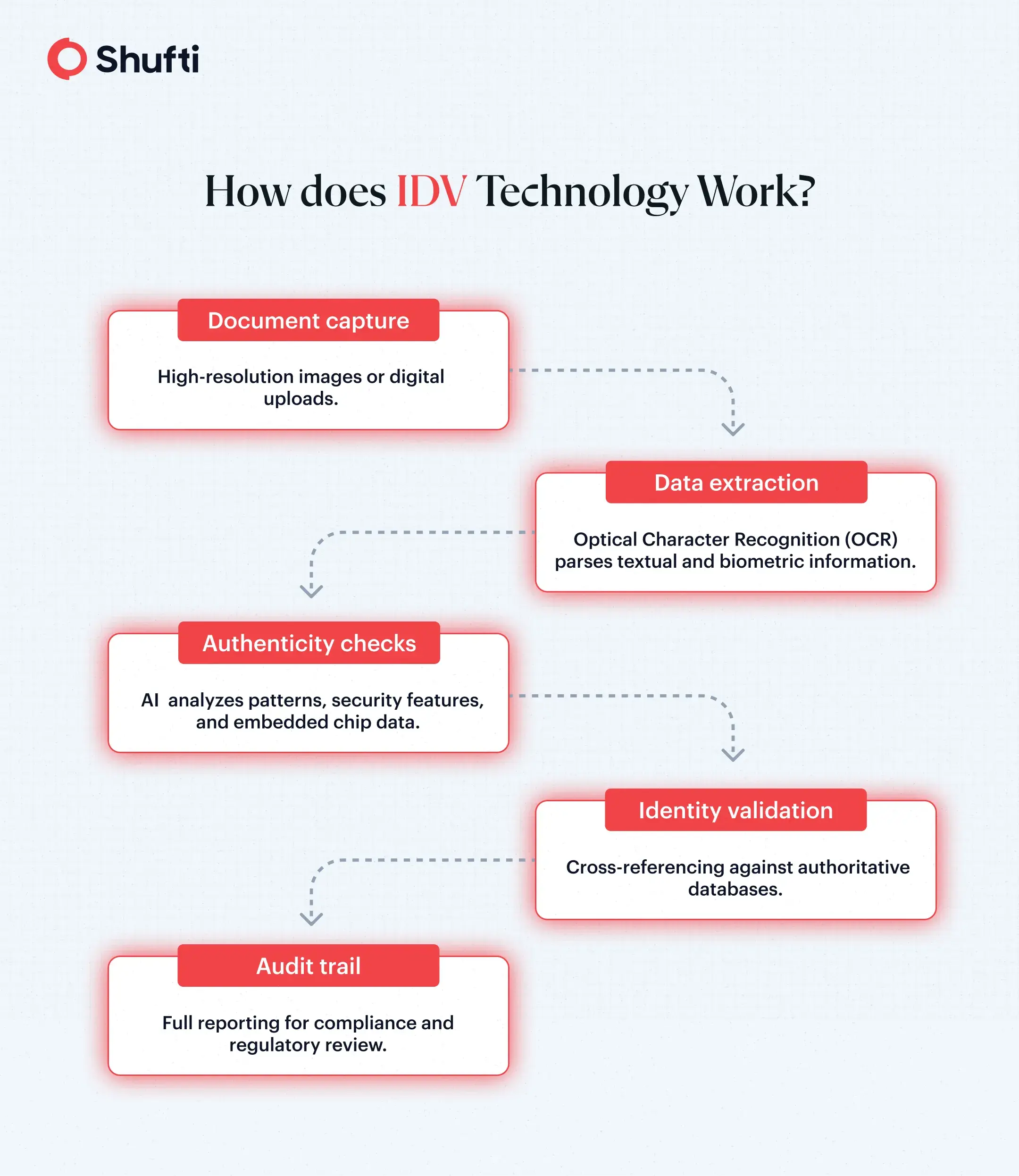 Shufti IDVT capabilities combine AI-based document fraud detection, chip-level verification, and coverage across thousands of document types in 240+ jurisdictions, so regulated entities gain accurate, auditable decisions with less manual review.