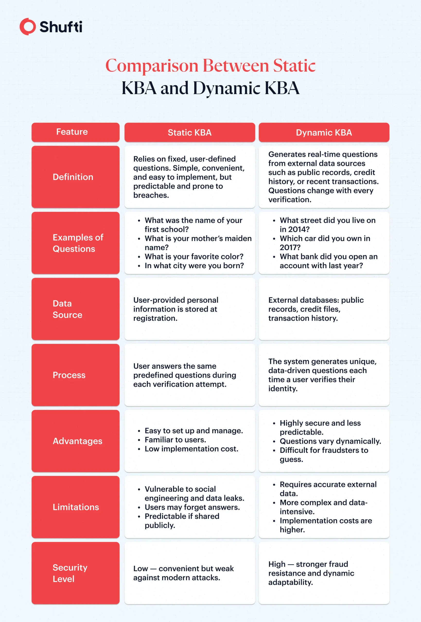 Static KBA uses pre-set questions, while dynamic KBA generates real-time questions from verified external data sources.