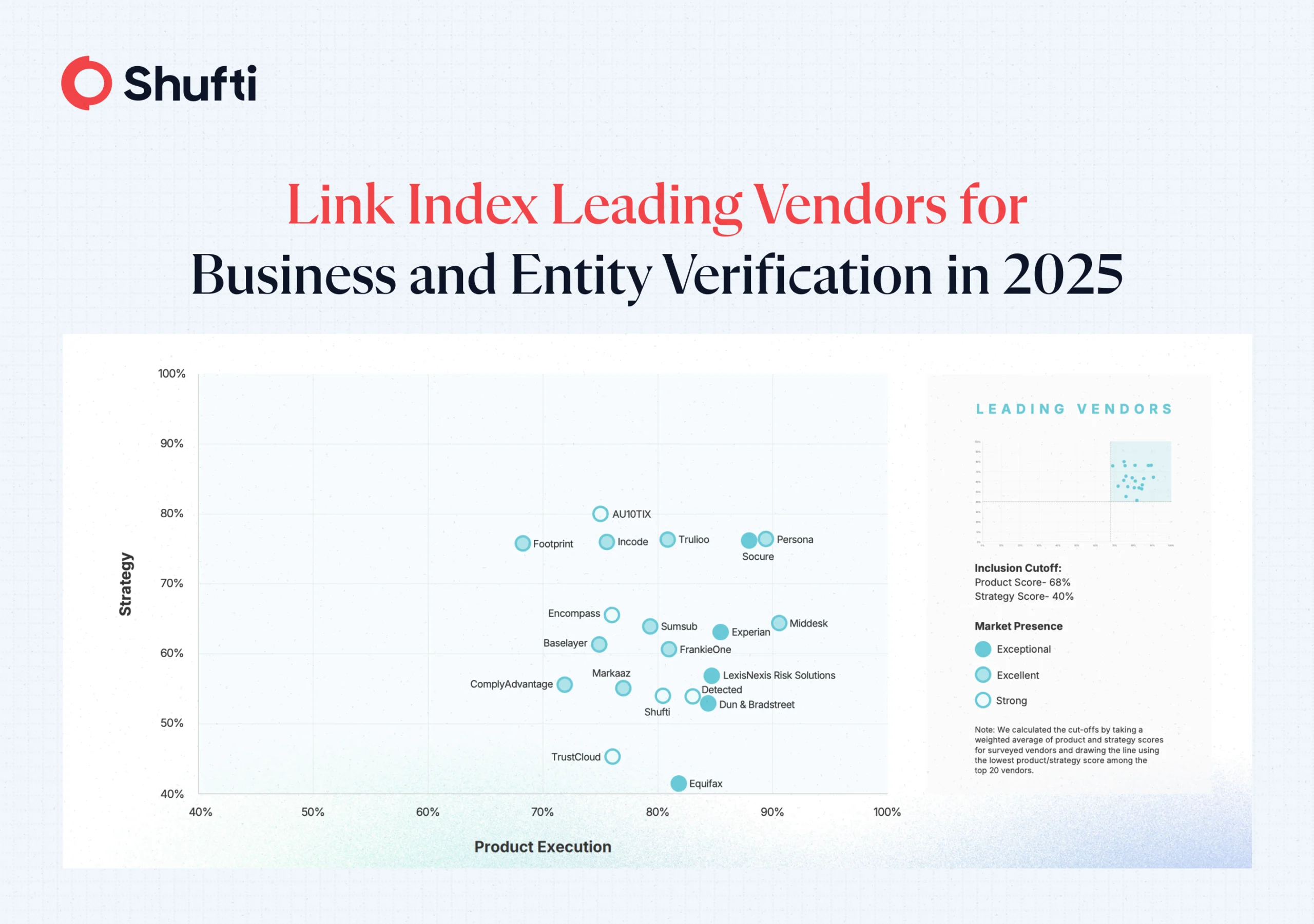After evaluating the BEV vendors, the Index identified 20 leading vendors. To earn this distinction, vendors had to meet minimum product execution (68%) and strategy (40%) thresholds. These benchmarks ensure that the selected vendors, such as Shufti, are highly effective in delivering business verification solutions and are in a position to meet the future needs of compliance.