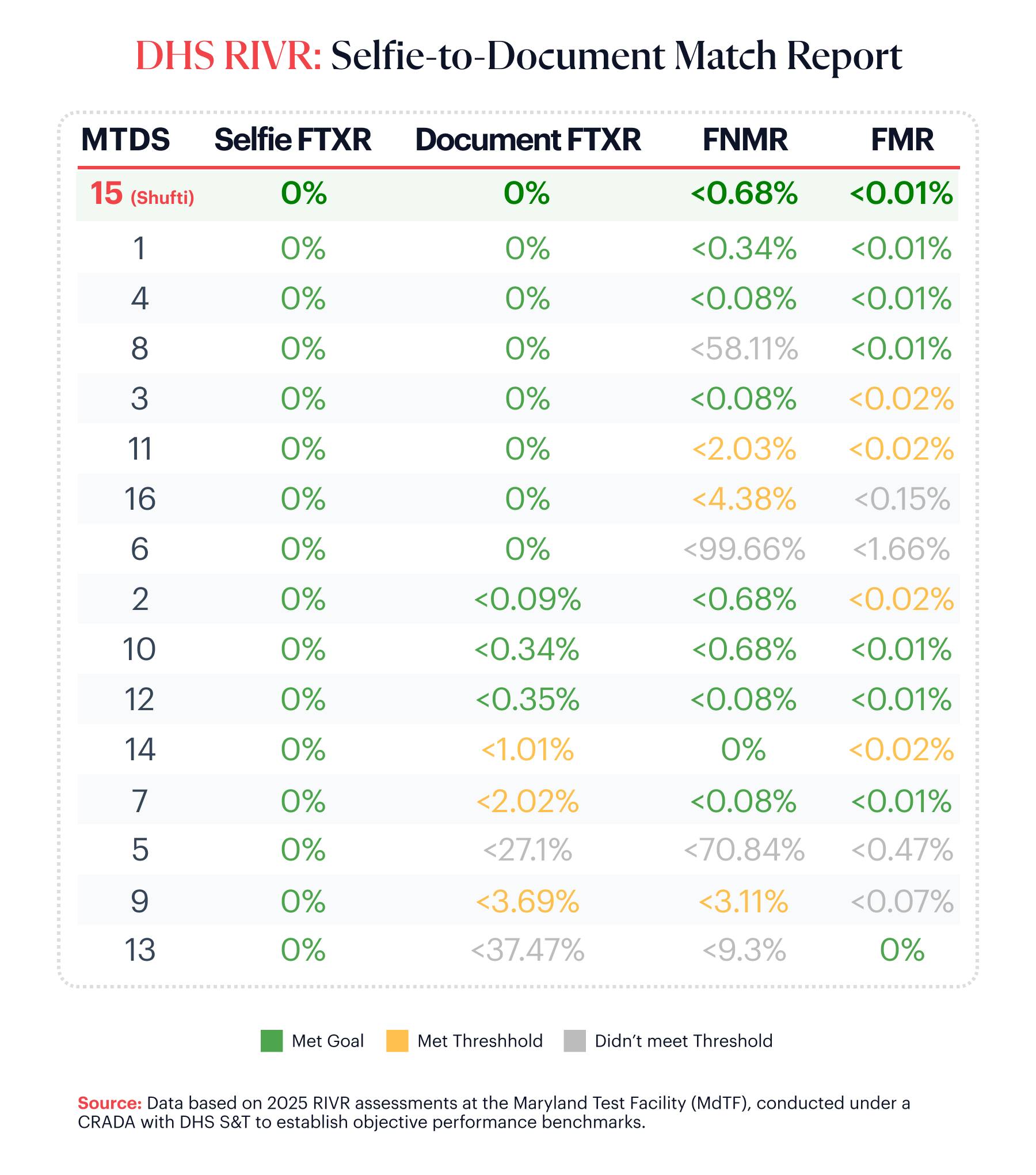 Shufti’s performance as MTDS 15, meeting RIVR goals across every evaluated metric, reinforces its role as a reliable identity verification provider for regulated environments.