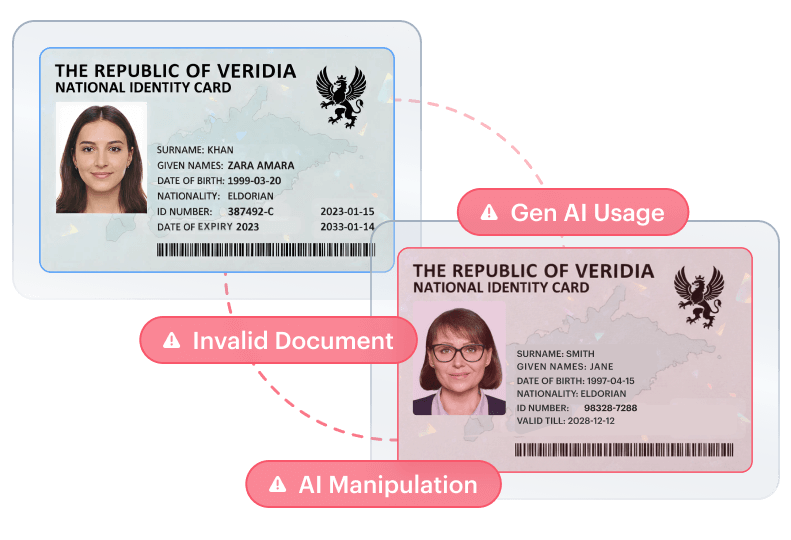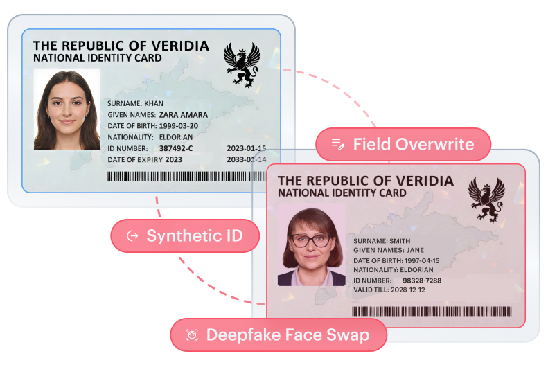 Altered or AI-generated documents designed to pass automated verification, data edits, image tampering, template imitation, synthetic creation. Often paired with face manipulation to complete a synthetic identity.