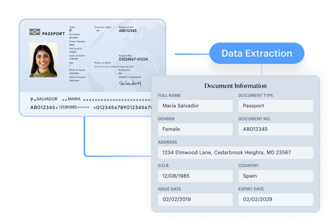 Supports government-issued IDs including passports, national ID cards, driving licences, residence permits and visas, plus supporting documents such as proof of address (for example, bank statements and utility bills), across 250+ regions.
