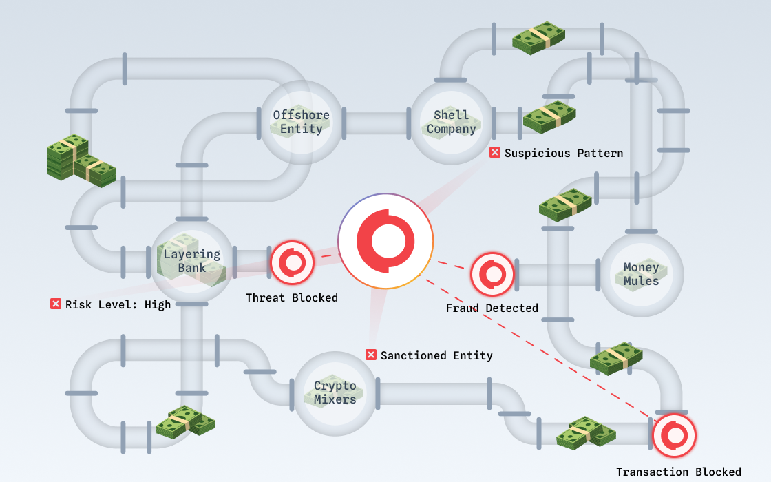 - Uses AI-driven risk scoring and continuous KYC/KYB verification to detect and block laundering networks before they escalate.