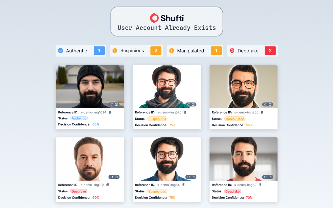 - Shufti identifies repeated or linked identities across accounts using facial and document verification.