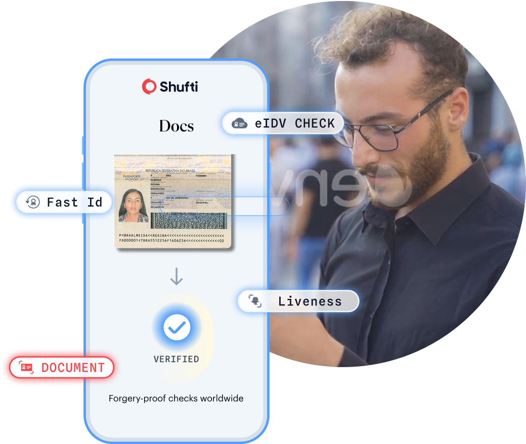 Identity verification is the process of confirming a person’s claimed identity through official documents, biometrics, eIDV or Shufti's FastID. Our smart IDV system streamlines this using AI-driven checks backed by human oversight, ensuring speed, accuracy, and reduced fraud risk.