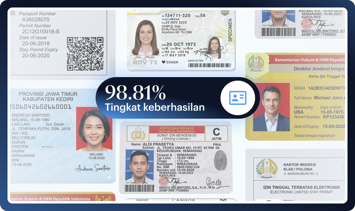 Checks KTP-el, passports, SIM, ITAS and KITAP across Latin-script fields, MRZ data and mixed physical or digital capture paths common in Indonesia.