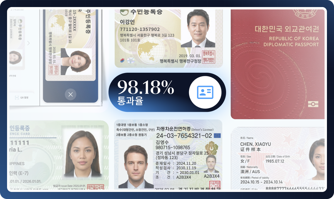 Guided capture helps users submit readable resident cards, passports, licences and residence cards for the first time, including Hangul and MRZ fields, reducing avoidable retries.