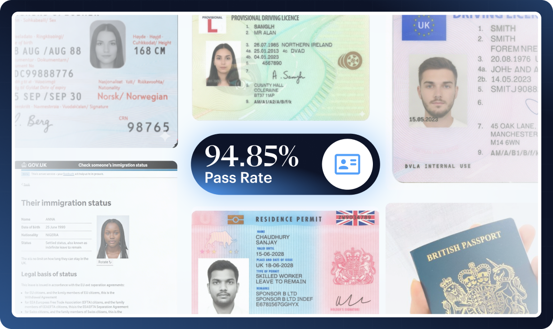 Supports UK passports, GB and NI driving licences, BRPs, and non-UK passports. We handle MRZ extraction, legacy format variants because multiple valid document designs coexist and no single national ID exists.