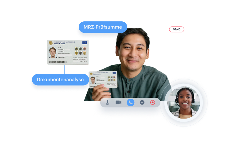 Der Agent leitet die Präsentation der Dokumente an, erfasst Bilder von Vorder- und Rückseite sowie von Sicherheitsmerkmalen, während KI die MRZ-Daten validiert und OCR-Extraktion durchführt. Pro Dokument werden mindestens drei Sicherheitsmerkmale geprüft (Hologramme, Mikroschrift, UV-Merkmale). Vorgeschrieben gemäß BaFin-VideoIdent-Rahmenwerk.