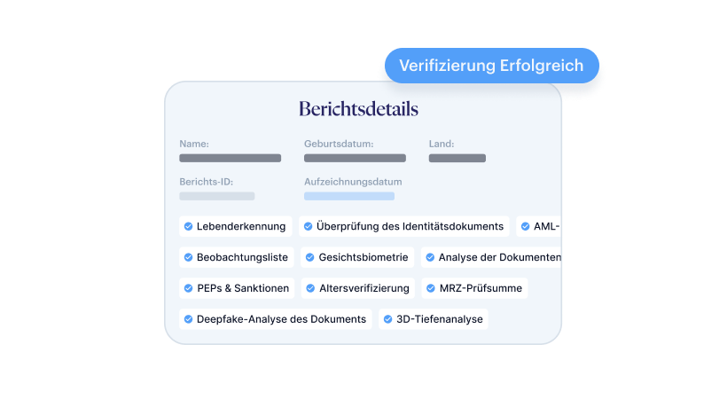 Schließen Sie den vollständigen Verifizierungsprozess in einer einzigen geführten Sitzung ab: Einwilligungserfassung, Gesichts und Dokumentenverifizierung, Adressverifizierung, AML-Screening gegen über 1,700+ Watchlists, TAN-/OTP-Sitzungsbindung. Konfigurieren Sie, welche Services enthalten sein sollen – basierend auf Ihren spezifischen regulatorischen Anforderungen und Risikorichtlinien.